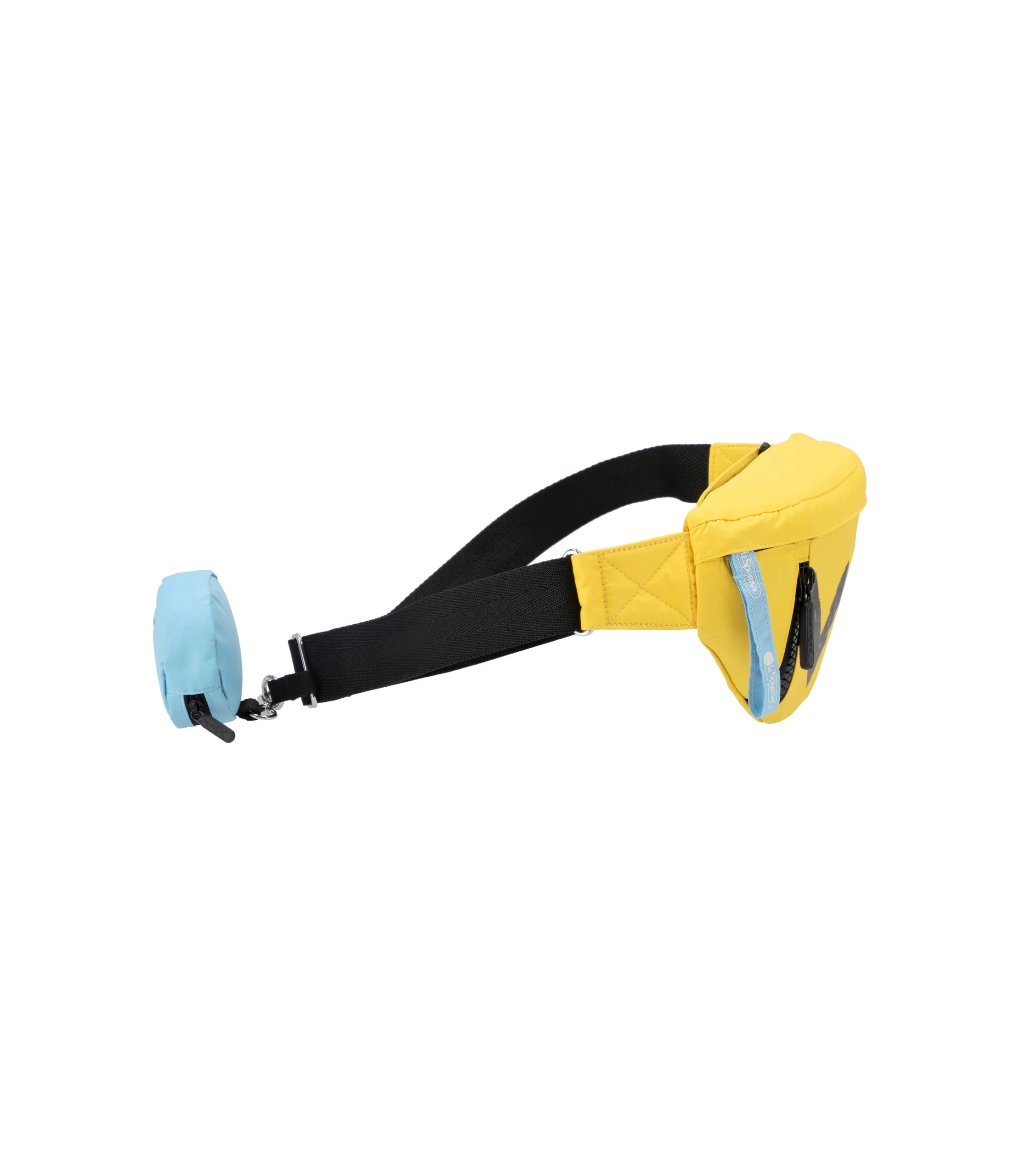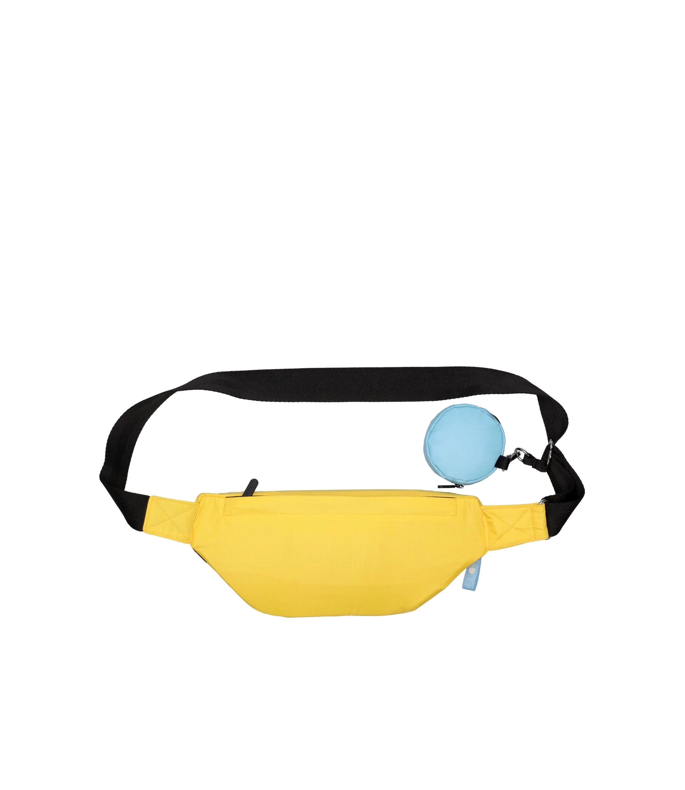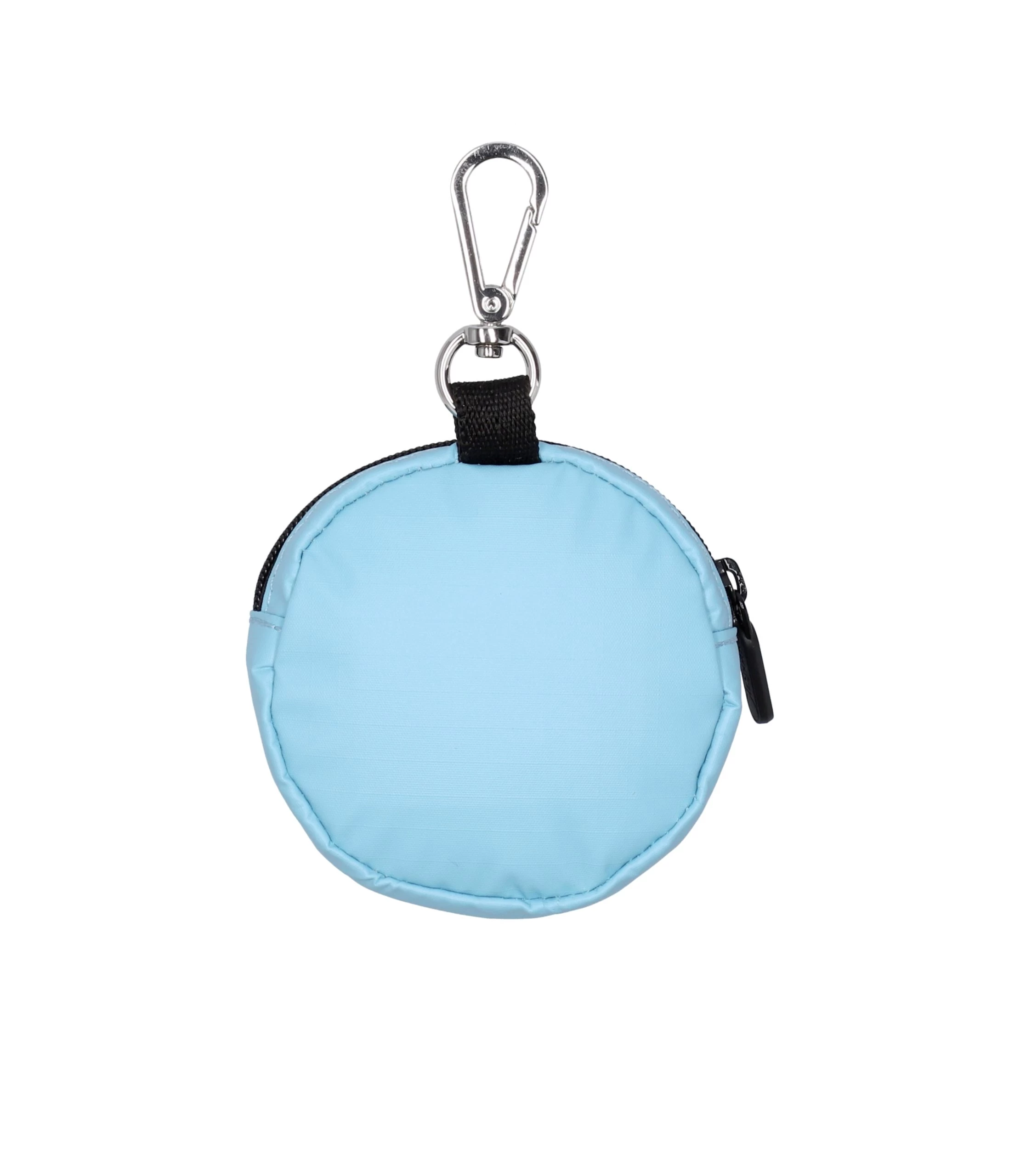 Zip main closure with logo grosgrain pull tab, Exterior front left side zip pocket, Exterior back zip pocket with three cards slots on interior back wall, 1.5in/2.5cm wide adjustable belt strap (Measured with bag – Max length: 50 in/127cm, Min length: 35 in/89 cm), Detachable mini round zip pouch for small items such as lip balm, coins, or wireless ear buds, 3.14H x 3.14H x 1.18D in, 8H x 8W x 3D cm