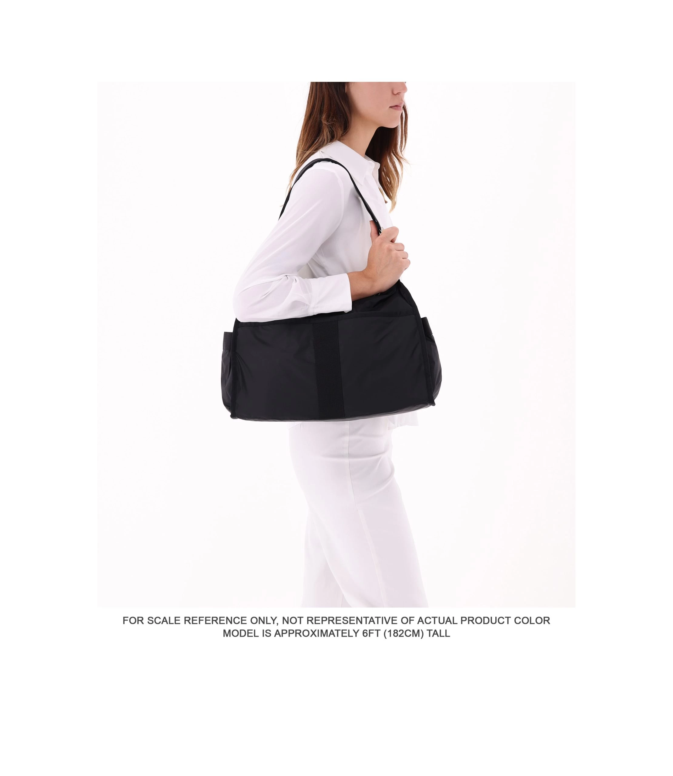 Zip top main closure, Exterior front pocket with zip closure, Exterior back side zip small pocket (for cellphone), Two exterior side open top pockets, Two interior front wall open pockets, Interior back wall large open pocket with an additional small zipper pocket, 1.5in/3.8cm wide adjustable shoulder strap (Min length: 12.6 in/32cm, Max length: 23.6 in/60 cm)