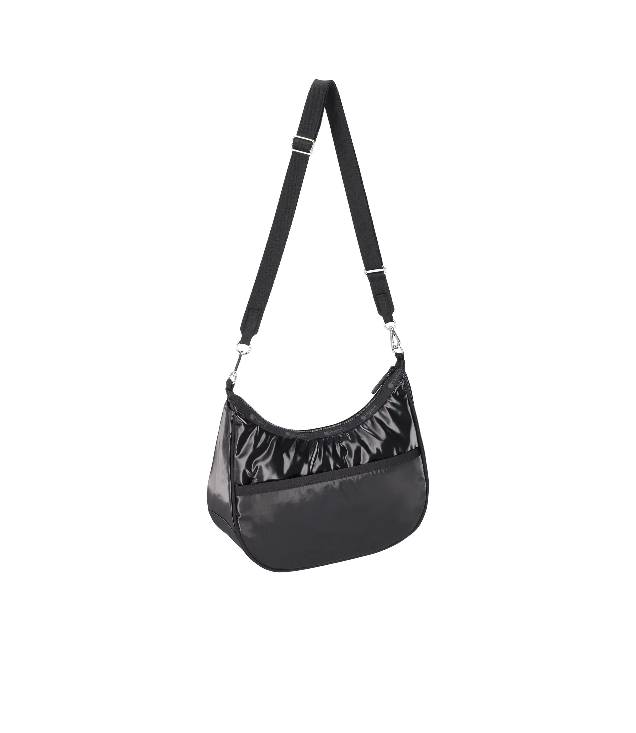 Zip top main closure, Exterior back pocket with zip closure, Interior front wall open pocket, Interior back wall combination zip/open pocket, Two detachable strap options: Short Strap – 1.5in/3.8cm wide non-adjustable strap (with a drop of 5.75in/14.6 cm and a length of 17.75in/45 cm) and Long Strap – 1in/2.5cm wide adjustable/detachable crossbody strap (min length: 24.8 in/63 cm and max length: 42.5 in/108 cm, ), Metal hardware